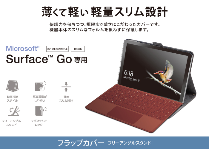 保護力を保ちつつ、極限まで薄さにこだわった軽量スリムなMicrosoft® Surface™ Go 2018年モデル用フラップカバーです。機器本体のスリムなフォルムを損ねずに保護します。