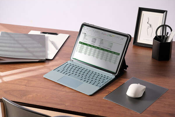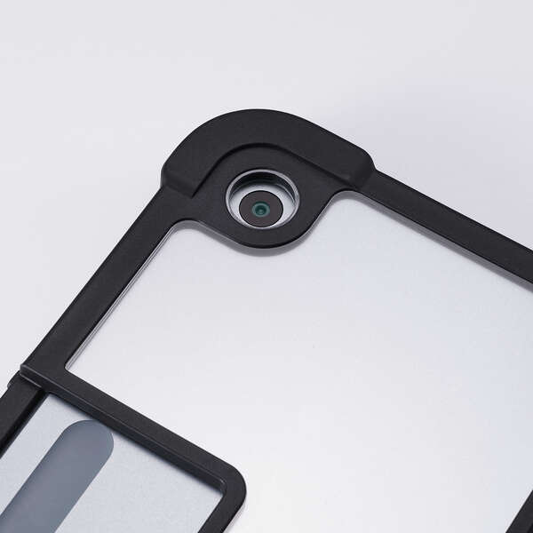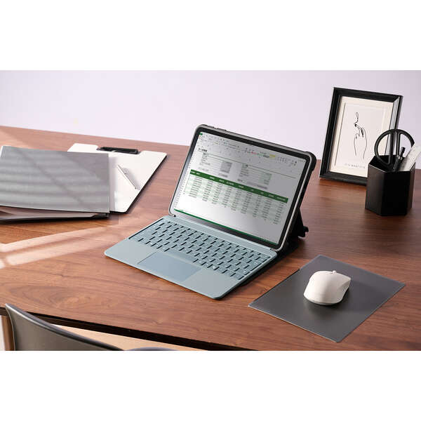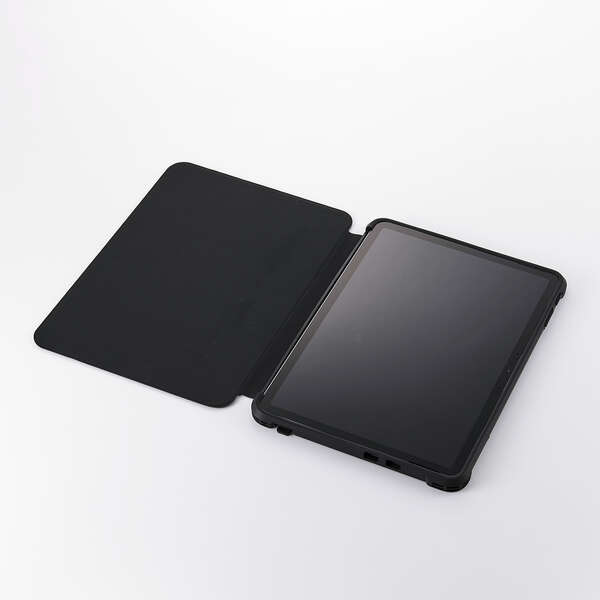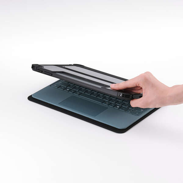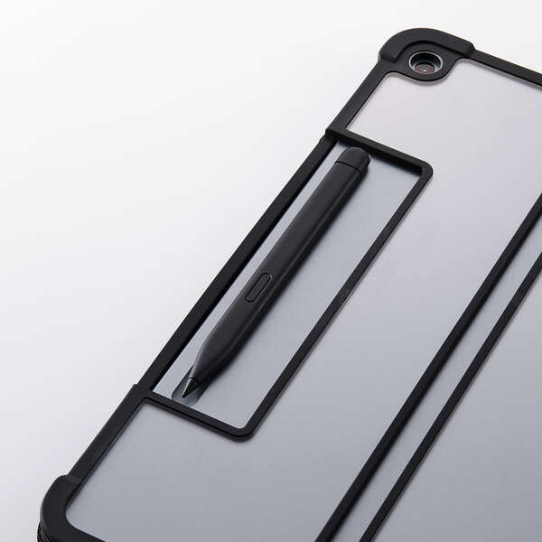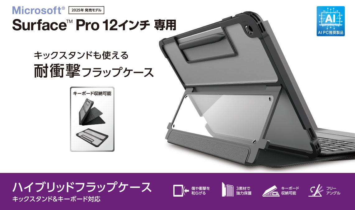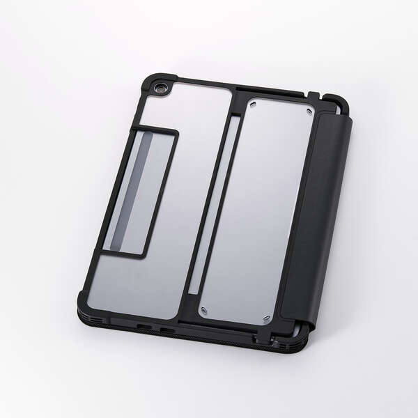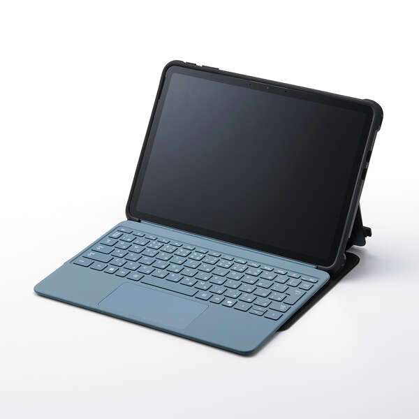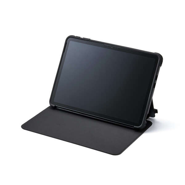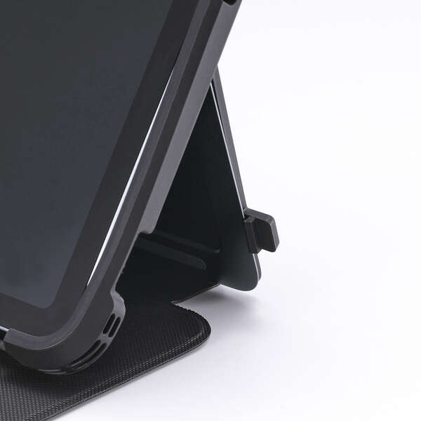 フリーアングルスタンド対応の衝撃に強いフラップケースです。端末と別売りキーボードをまとめて持ち歩けます。