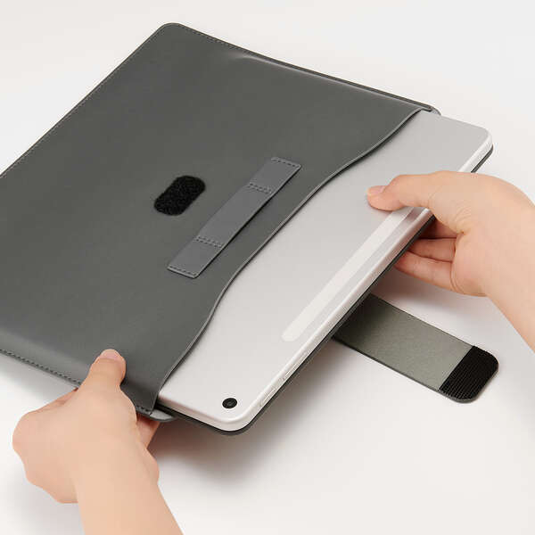 面ファスナーで留められるベルト付きで、タブレットの落下を防いで本体を守ります。