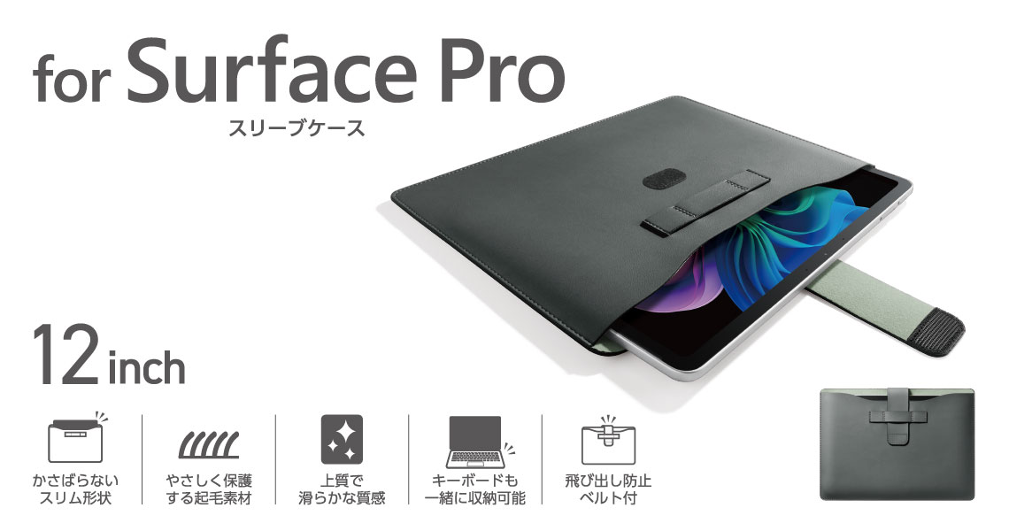 Microsoft Surface Pro12インチ専用に設計されたスリムなスリーブケースです。別売りのキーボードを一緒に収納して、まとめて持ち運べます。Microsoft Surface Pro 12インチと合わせて使えるカラーリングの製品です。