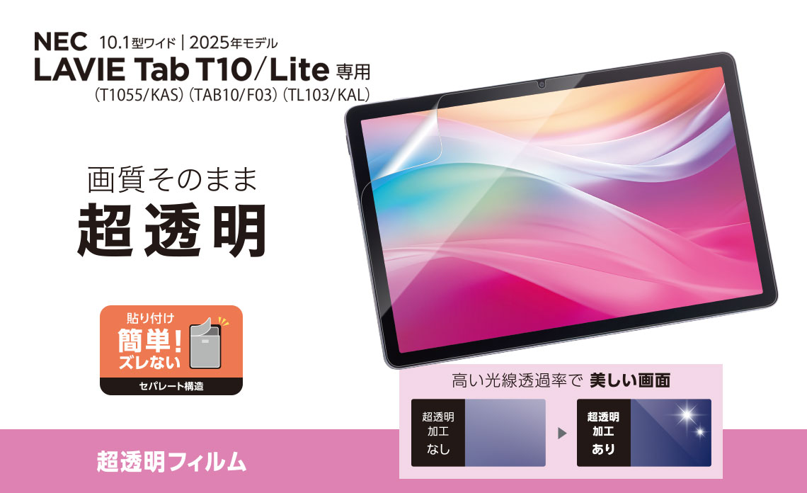 気泡がキレイに抜けるエアーレスタイプ。画面を傷や汚れから守る、超透明タイプの画面保護フィルムです。