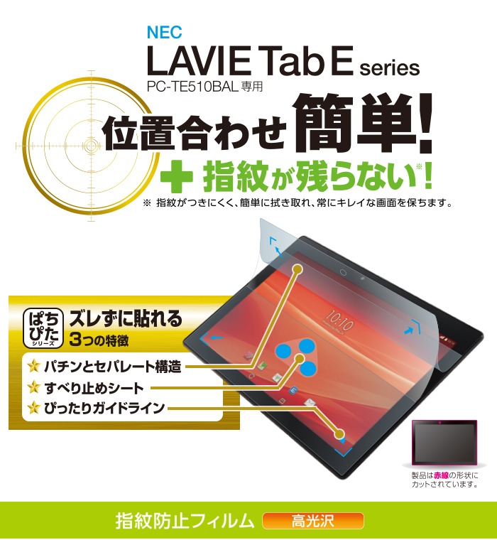 - NEC LAVIE Tab E PC-TE510BALの液晶画面を傷や汚れから守る、指紋防止・高光沢タイプの液晶保護フィルムです。