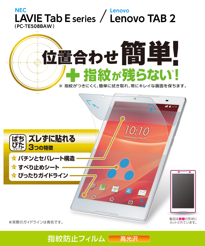 - NECLAVIETabEPC-TE508BAW及びLenovoTAB2にぴったりのサイズにカット済みなので、パッケージから取り出してすぐに使用可能です。