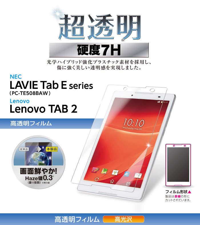 - NECLAVIETabEPC-TE508BAW及びLenovoTAB2の液晶画面を守る、傷に強く、美しい透明感を実現したスムースタッチ高光沢タイプの液晶保護フィルムです。