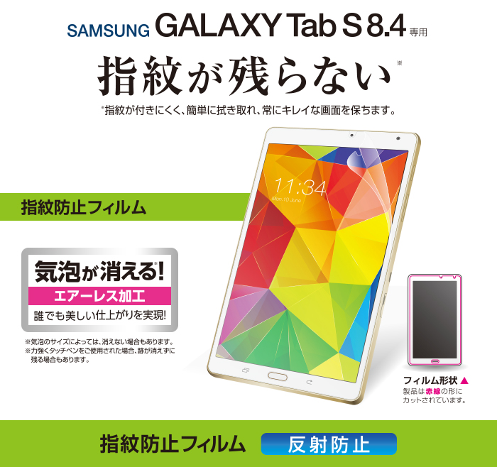 気泡がキレイに抜けるエアーレスタイプ。Samsung GALAXY Tab S 8.4 SM-T700の液晶画面をキズや汚れから守る、防指紋タイプの液晶保護フィルム。