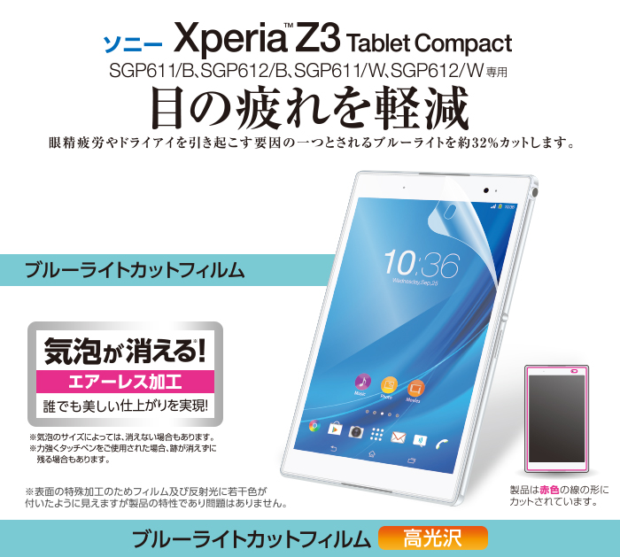 - SONY Xperia(TM) Z3 Tablet Compactの液晶画面を傷や汚れから守る、ブルーライトカット・高光沢タイプの液晶保護フィルムです。
