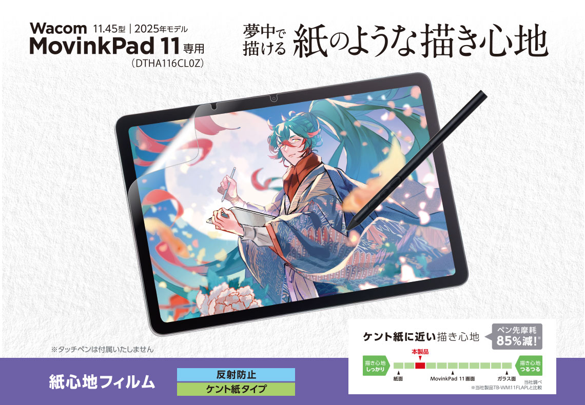 Wacom MovinkPad 11 (DTHA116CL0Z)対応の紙心地フィルムです。特殊表面形状デザインによりケント紙に鉛筆で描いたような描き心地を実現します。指紋防止・反射防止タイプで画面を傷や汚れから守ります。