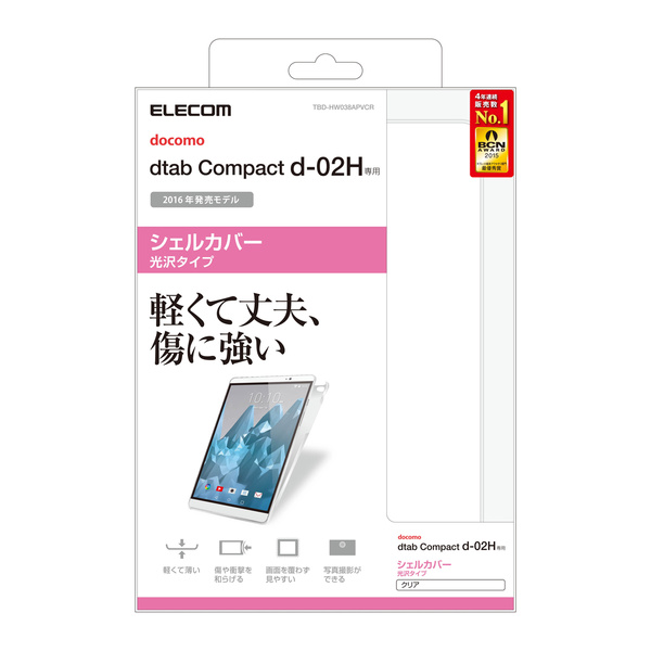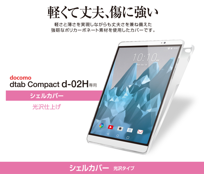 傷や汚れから守る、軽くて丈夫なポリカーボネート製のdtab Compact d-02H用シェルカバーです。