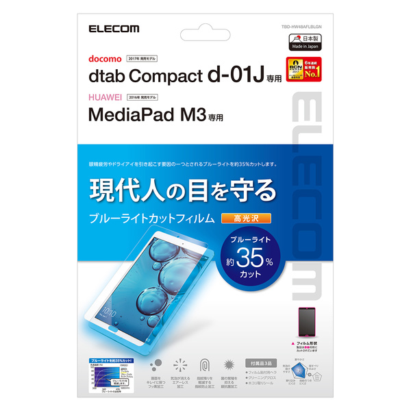- dtab Compact d-01Jの液晶画面を傷や汚れから守る、ブルーライトカット・高光沢タイプの液晶保護フィルムです。