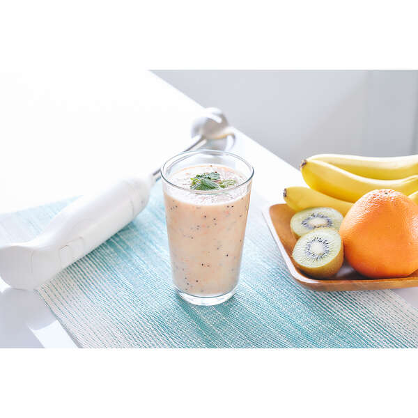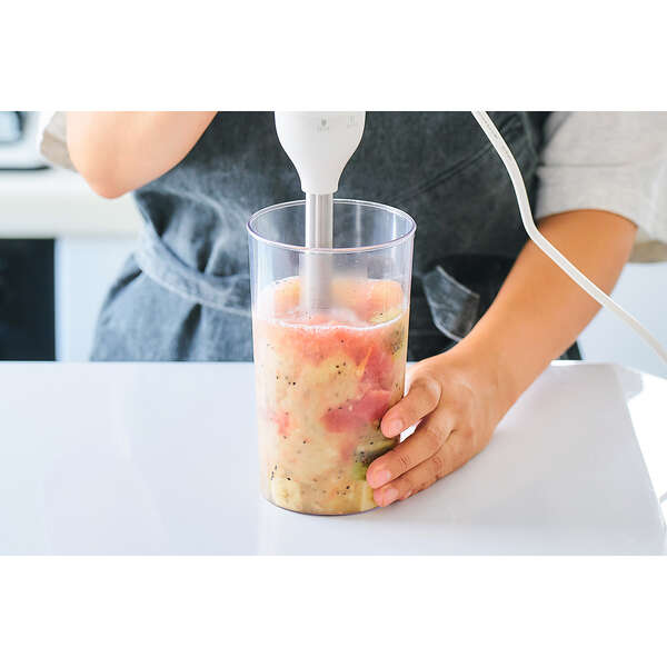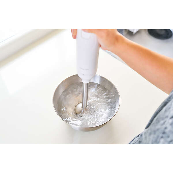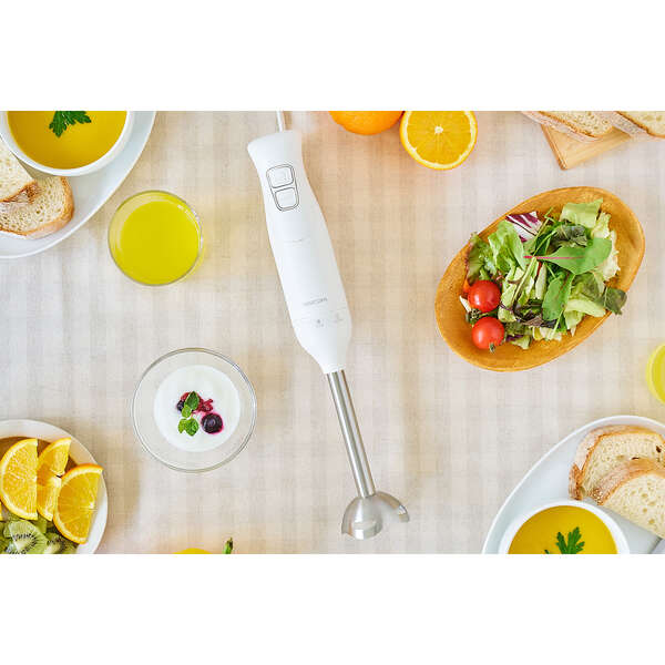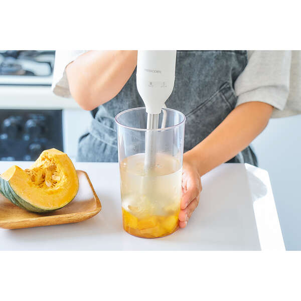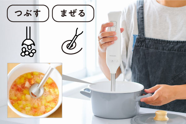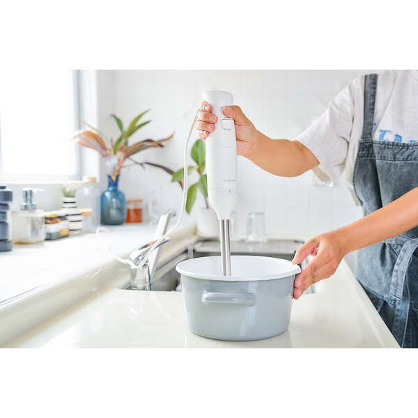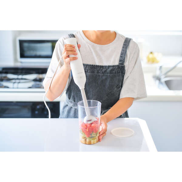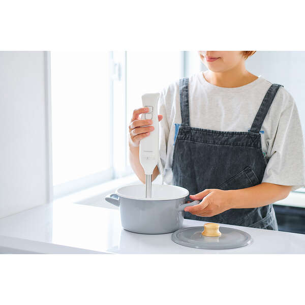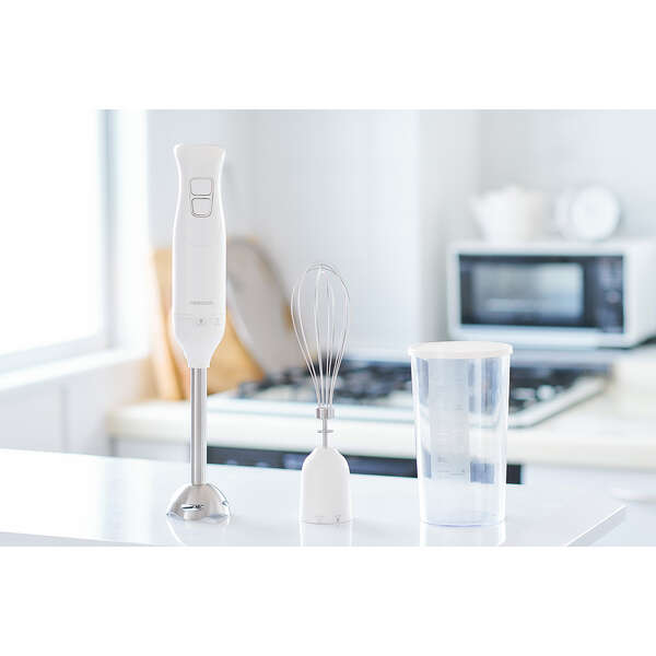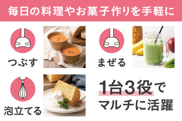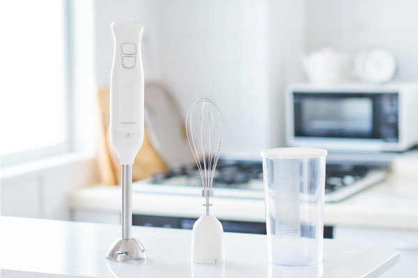 ブレンダーとビーターによる、つぶす・まぜる・泡立てる「1台3役」で調理の下ごしらえがラクラクな、お手軽ハンドブレンダーです。