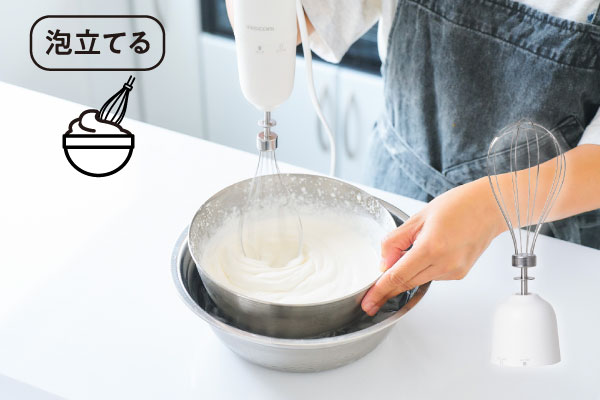 バルーンビーターのホイッパー機能により、クオリティーの差が出やすい生クリームやメレンゲも、短時間で安定して泡立てることができます。
