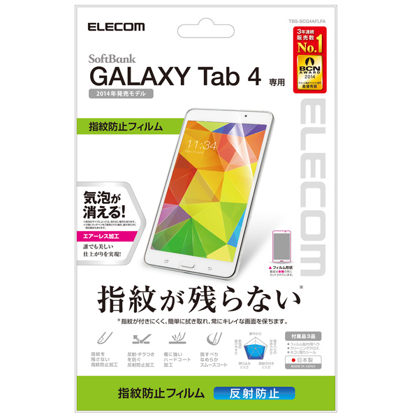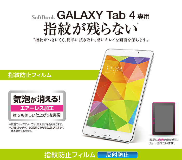 気泡がキレイに抜けるエアーレスタイプ。SoftBank GALAXY Tab 4の液晶画面をキズや汚れから守る、防指紋タイプの液晶保護フィルム。
