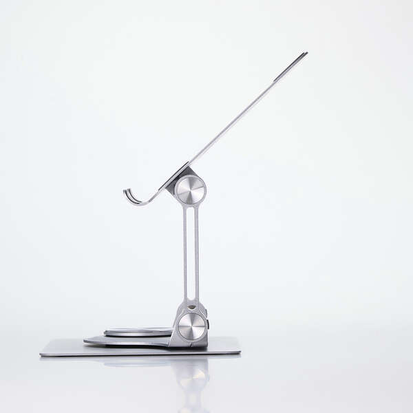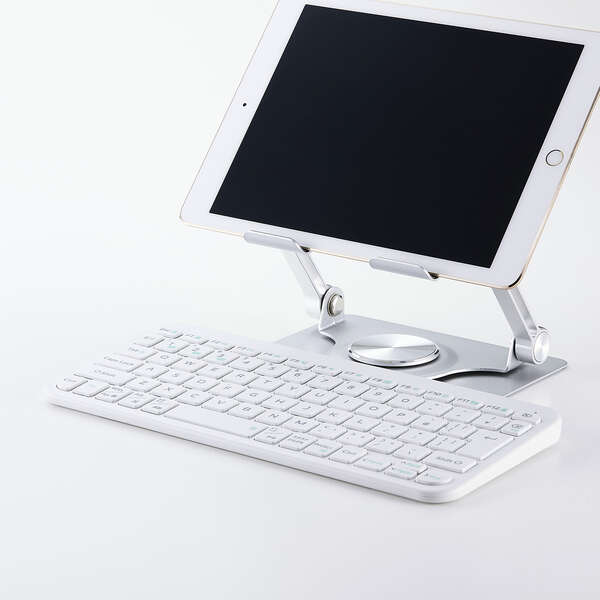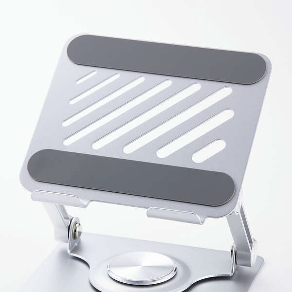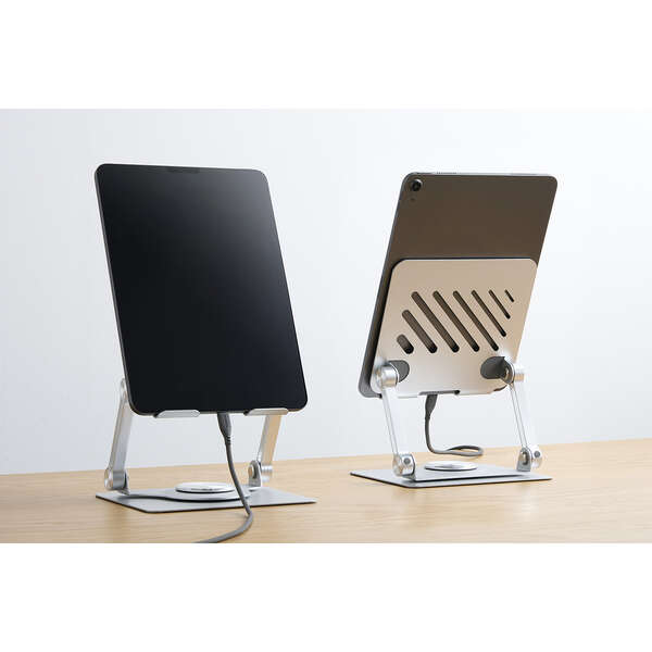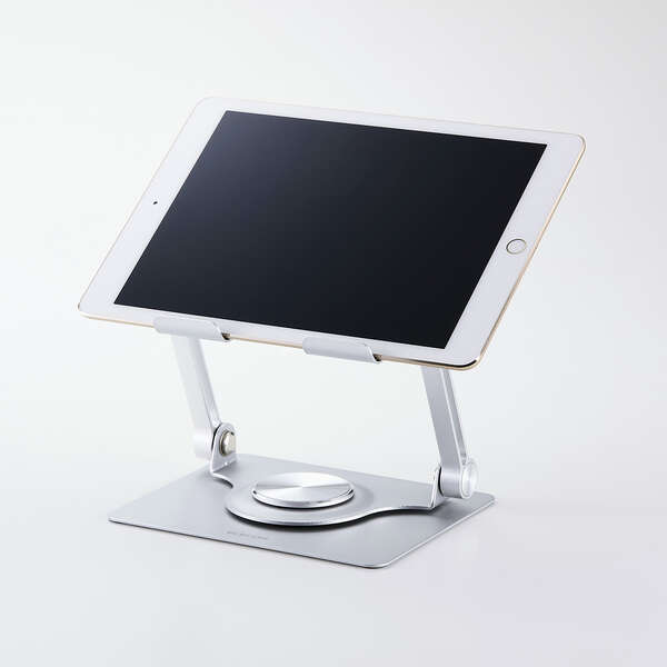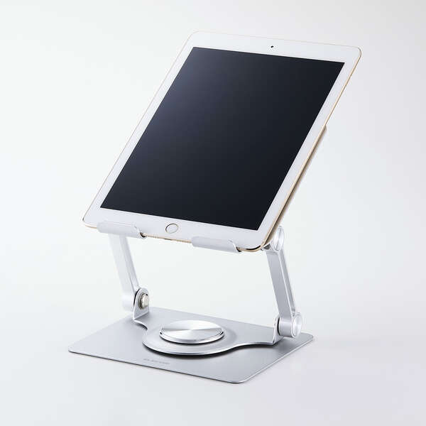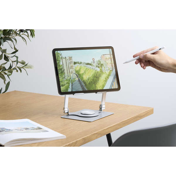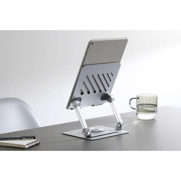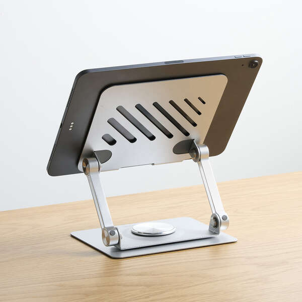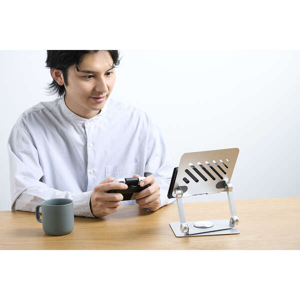 お好みの高さや角度に加え、左右への向きも自由に変えられる折り畳み式タブレットスタンドです。動画視聴やオンライン会議、資料閲覧など幅広いシーンに合わせて活躍します。