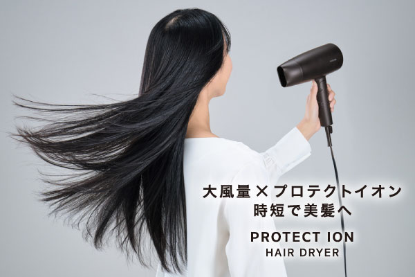 毎日気軽に使えるミニマル速乾ヘアドライヤーです。大風量の3.6m3/分(※)で髪をすばやく乾かし、時短ドライを叶えます。プロテクトイオンが静電気を抑え、ツヤとまとまりのあるなめらかな美髪へ導きます。 ※TURBO使用時 自社測定による ※JIS規格では1.8m3/分