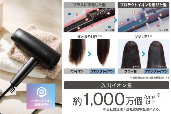マイナスイオンとプラスイオンを同時に放出し、それぞれのイオン(※)が髪に働いて、髪の広がりや傷みの一因となる静電気を抑制します。また、髪のツヤもアップします。