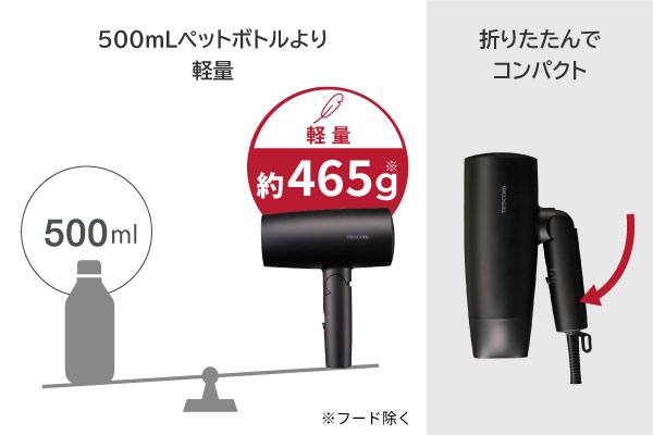 毎日使うことを考えた軽量デザイン。500mlペットボトルよりも軽く、折りたためるコンパクトな設計なので、スペースをとらず収納にも便利です。
