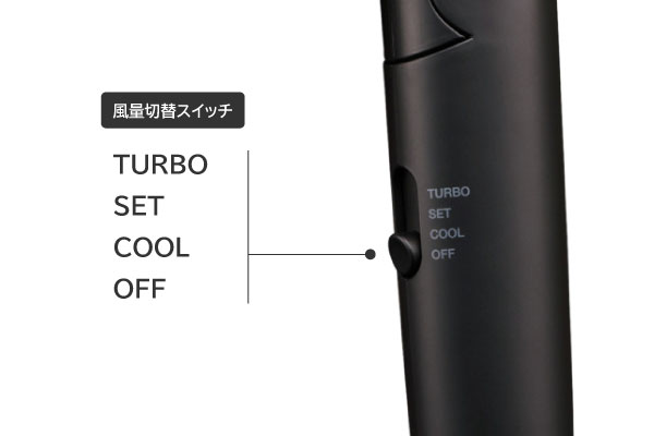TURBO/SET/COOLの風量モードとOFFを切り替えられるスライドスイッチは、シンプルな操作で使いやすいミニマル機能。忙しい毎日のヘアドライを快適にサポートします。