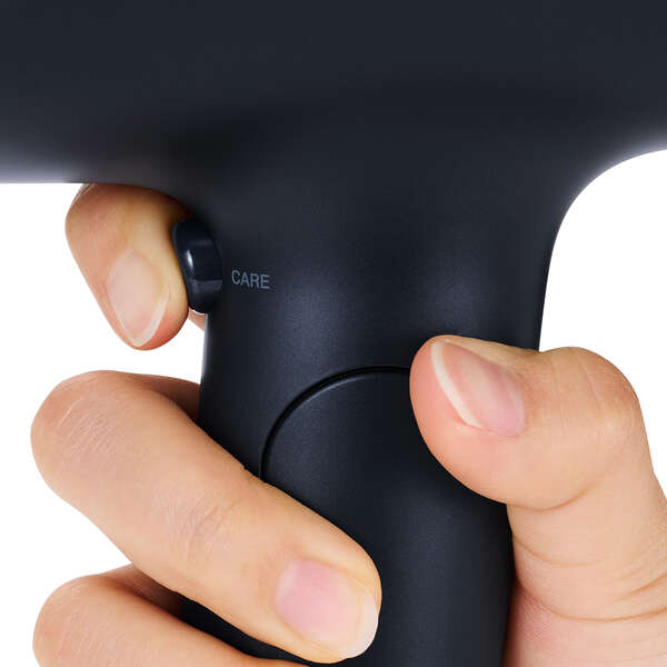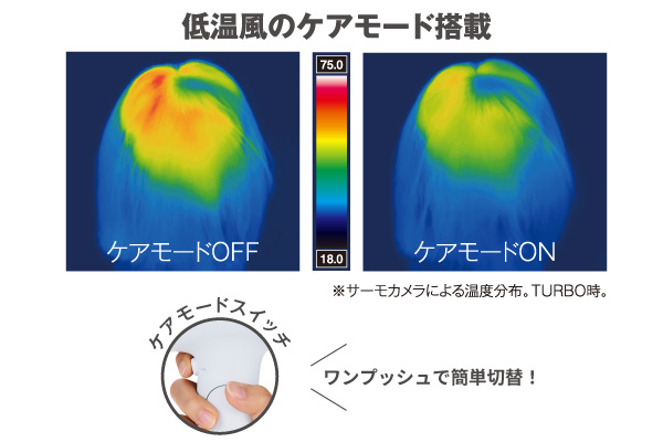 髪をやさしくいたわり、熱ダメージを抑えられる低温風のケアモードを搭載。独立スイッチなので、ワンプッシュで簡単にケアモードに切り替えられます。