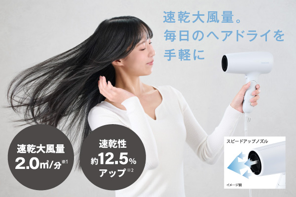 大風量の2.0m3/分(※1)と本体内蔵スピードアップノズルで、髪を根元から素早く乾かせます。速乾性約12.5%アップ(※2)で、忙しい毎日も時短でヘアドライができます。