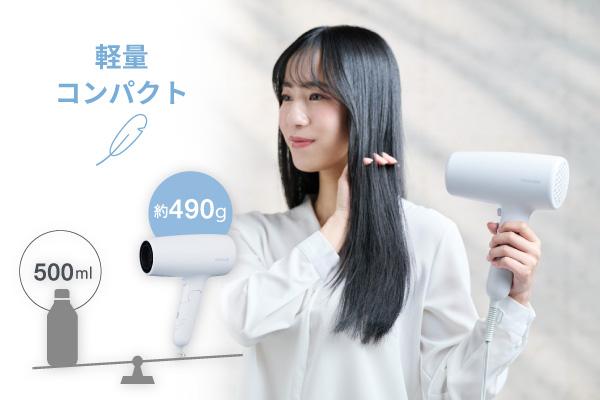 毎日使うことを考えた軽量デザイン。500mlペットボトルよりも軽く、ノズルもコンパクトな設計で使いやすく、ヘアドライも快適です。