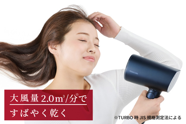 1300Wのハイパワーにより温風をしっかりキープし、大風量2.0m3/分の風で髪をすばやく乾かせるので、忙しい朝も時短でヘアドライができます。