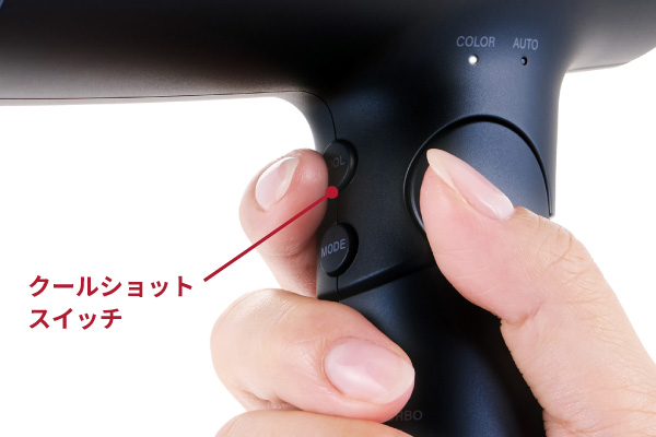 クールショットスイッチを押せば、ワンタッチですぐに冷風に切り替えられます。冷風をヘアドライの仕上げに使うと、スタイリングを長時間キープしやすくなります。