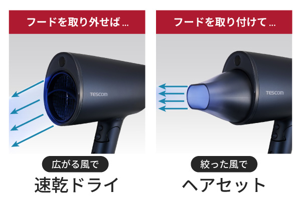 セットフードを取り付けることで、風の出口が絞られ、直線的でピンポイントな風が出ます。毛先のセットや前髪の立ち上げなどにおすすめです。