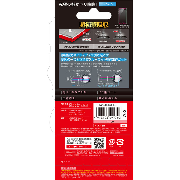 - 高い透過率でiPhone 6s / iPhone 6の液晶画面を美しく守り、なめらかな指すべりで快適にゲームの操作ができるスムースタイプの液晶保護フィルム。液晶ディスプレイが発する光の中の青い部分「ブルーライト」を大幅にカットするブルーライトカットタイプ。