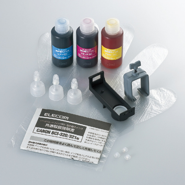 よく使うシアン・マゼンタ・イエローの3色セット。キヤノン「BCI-321」インクタンク対応の詰め替えインクセット。