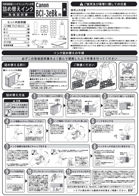 CANON用詰め替えインク:インクタンクBCI-3対応インクでBLACKインクです。付属品(汚れ防止手袋、汚れ拭きペーパー、綿棒、取扱説明書)