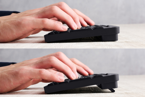 姿勢に合わせて傾斜角を2段階で調整できる角度調整スタンドが付いています。 スタンドにはキータッチを安定させる滑り止めが付いています。