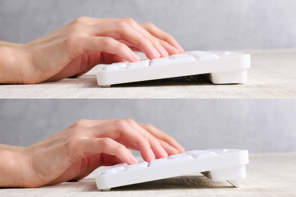 姿勢に合わせて傾斜角を2段階で調整できる角度調整スタンドが付いています。 スタンドにはキータッチを安定させる滑り止めが付いています。