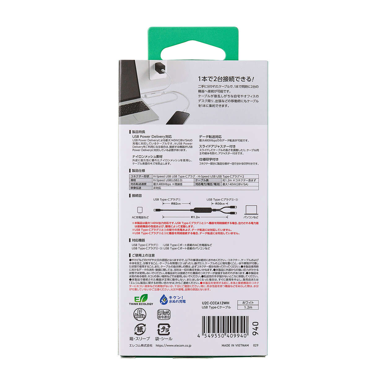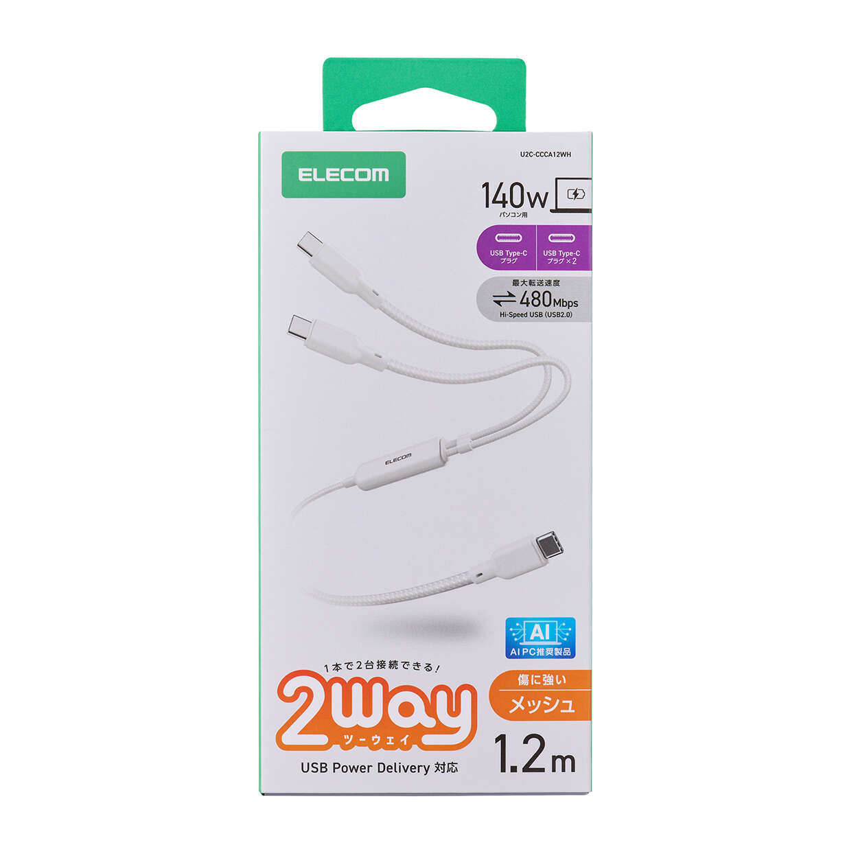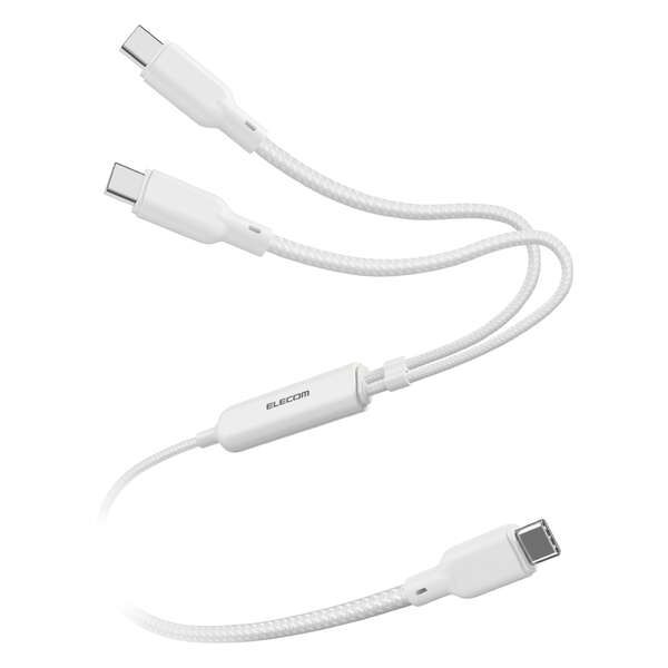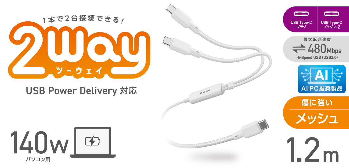 これ1本で2台同時に充電!2つのUSB Type-C(TM)ケーブルを1本にまとめた、USB Power Delivery(最大140W)対応の2WAYケーブルです。散らかりがちな充電ケーブルをすっきり配線でき、持ち運びも1本に集約できます。傷に強く、耐久性に優れたナイロンメッシュケーブルを採用しています。