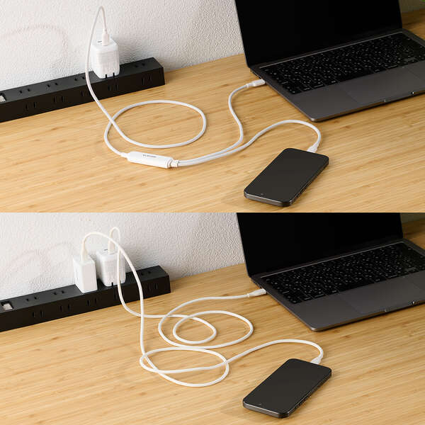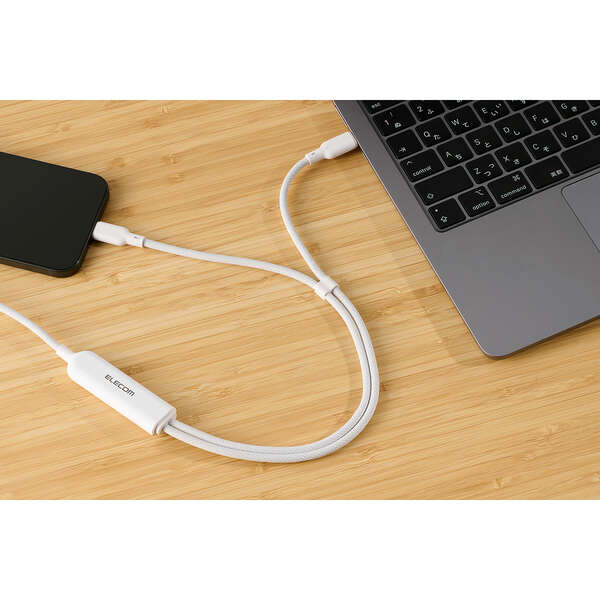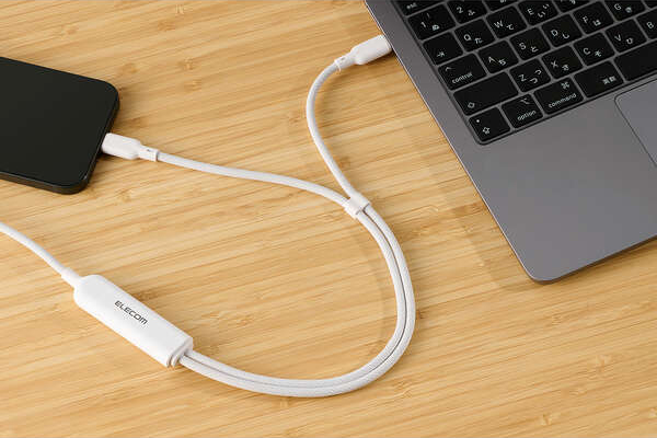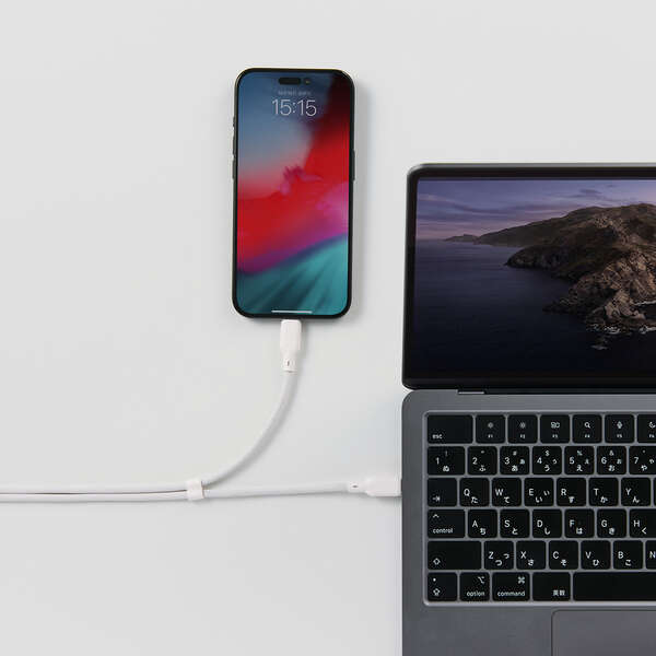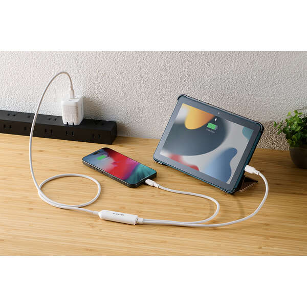 ケーブル1本でパソコンやスマートフォンなどの機器を2台同時に充電可能。散らかりがちなケーブルをすっきり配線でき、旅行や出張など外出先への持ち運びも1本に集約できます。