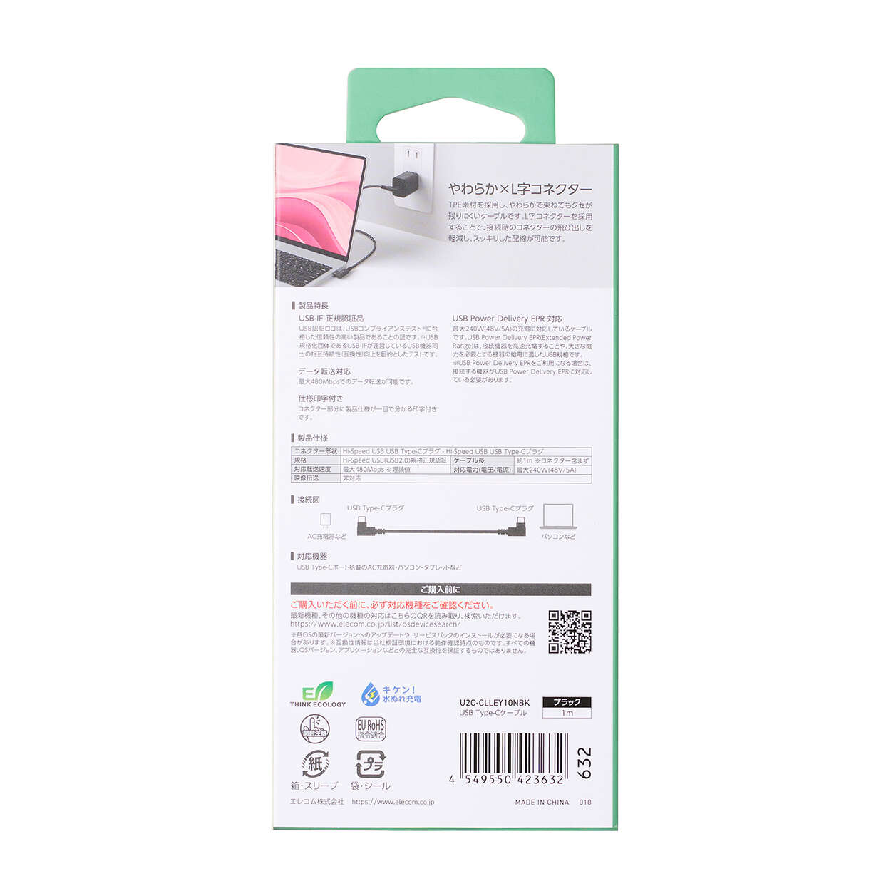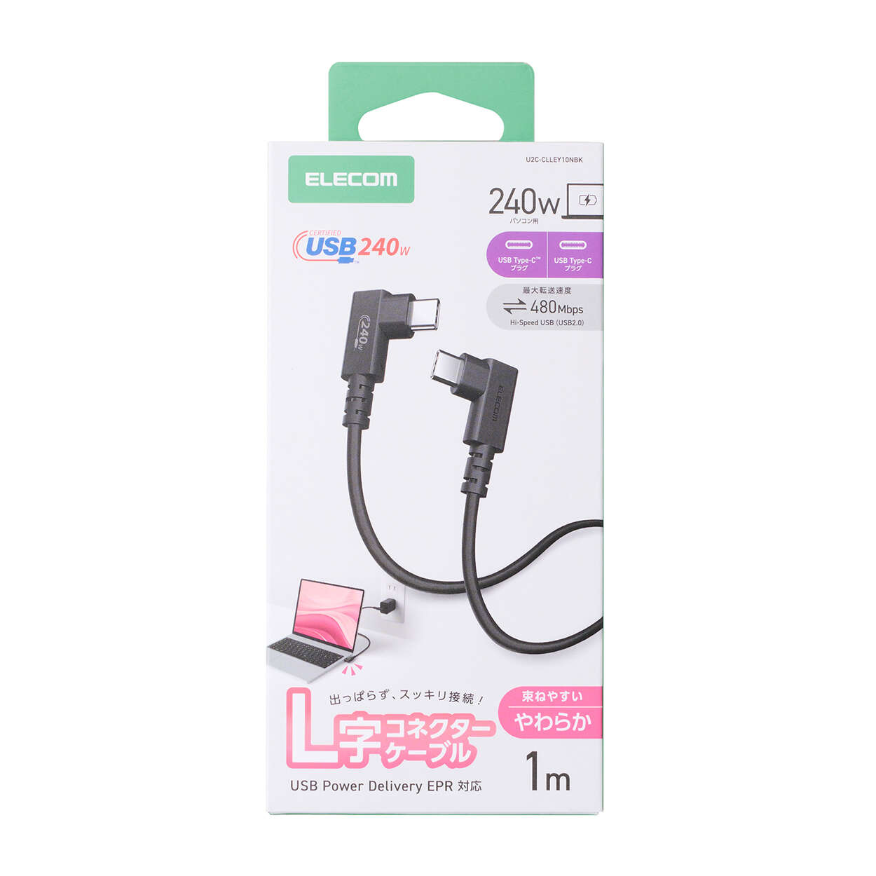 コネクターが出っ張らないから、デスク周りがすっきり!最大240WのUSB Power Deliveryに対応したUSB Type-C(TM)ケーブルです。束ねてもクセが残りにくいやわらかケーブルで、すっきりした配線が可能なL字コネクターを両端に採用しています。