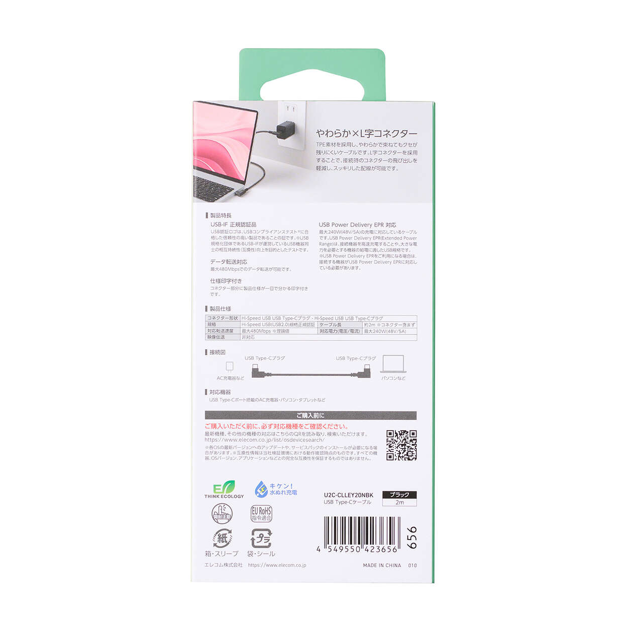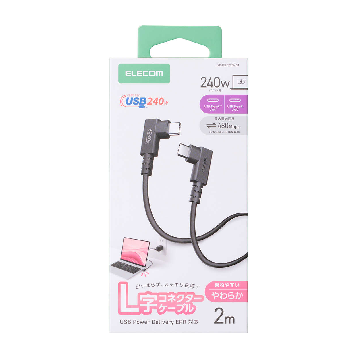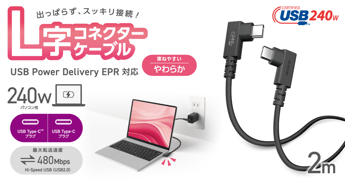 コネクターが出っ張らないから、デスク周りがすっきり!最大240WのUSB Power Deliveryに対応したUSB Type-C(TM)ケーブルです。束ねてもクセが残りにくいやわらかケーブルで、すっきりした配線が可能なL字コネクターを両端に採用しています。