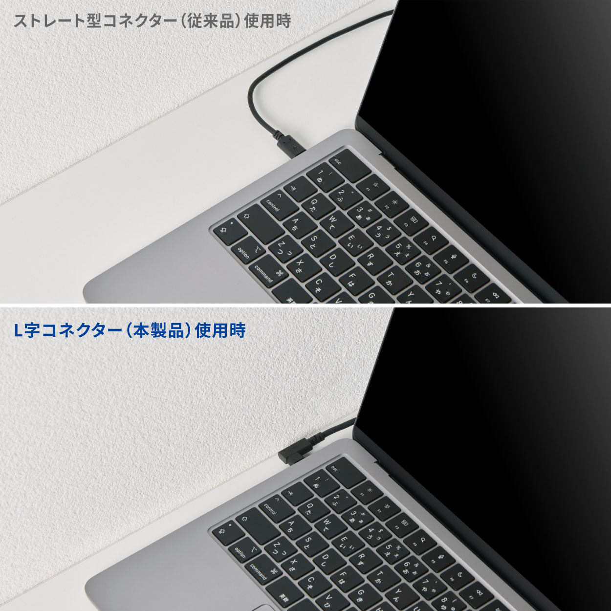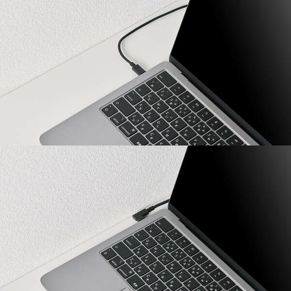 ケーブルの両端にL字コネクターを採用し、飛び出しが少ないすっきりした配線が可能なUSB Type-Cケーブルです。