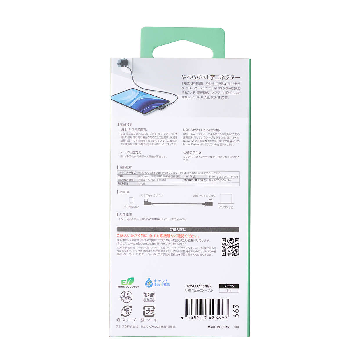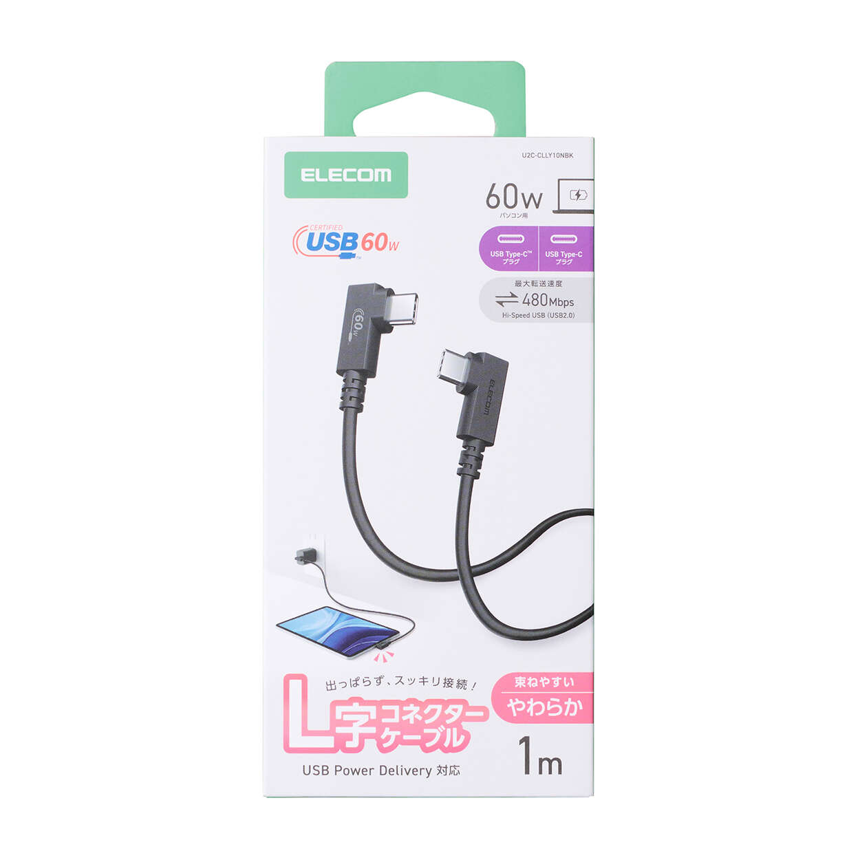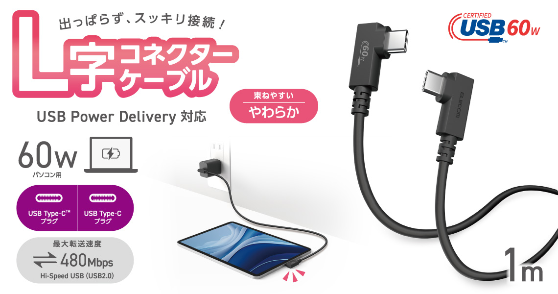 コネクターが出っ張らないから、デスク周りがすっきり!最大60WのUSB Power Deliveryに対応したUSB Type-C(TM)ケーブルです。束ねてもクセが残りにくいやわらかケーブルで、すっきりした配線が可能なL字コネクターを両端に採用しています。