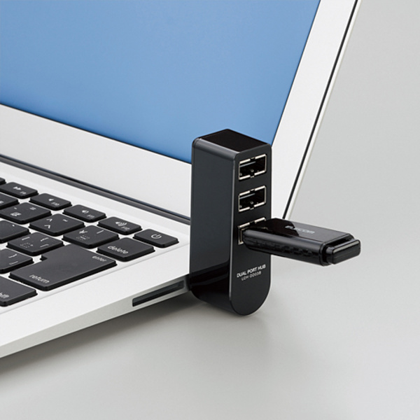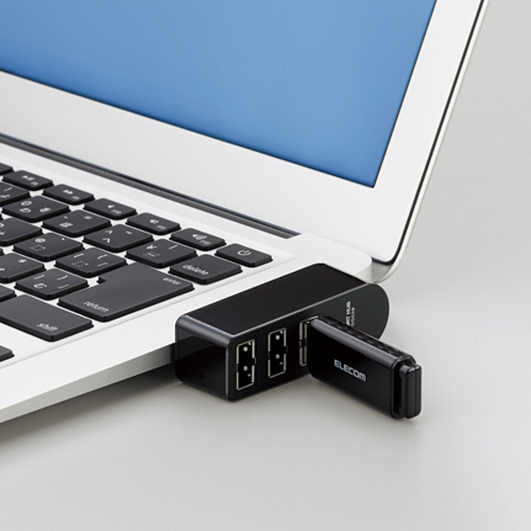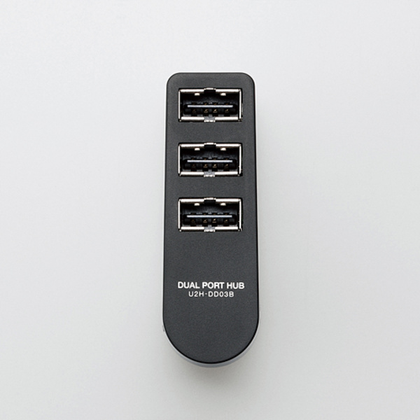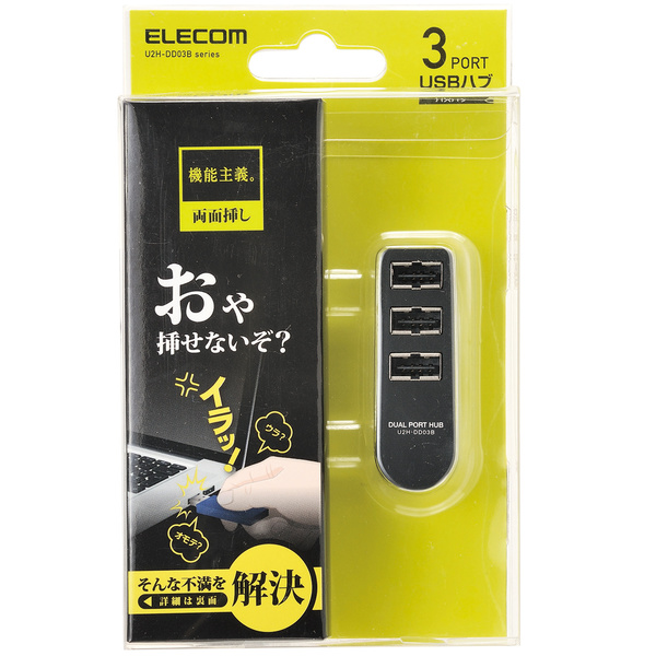 表でも裏でも、どちらからでも挿し込む向きを気にせずに使える!ノートパソコンなどに直挿しできるコンパクト設計の両面挿しバスパワー専用3ポートUSBハブ。