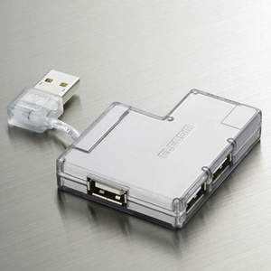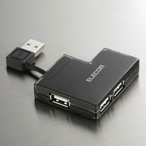 コンパクトなUSB2.0ハブ。アップストリームコネクタをダウンストリームポートに差し込んで収納可能。セルフパワー/バスパワー両用。