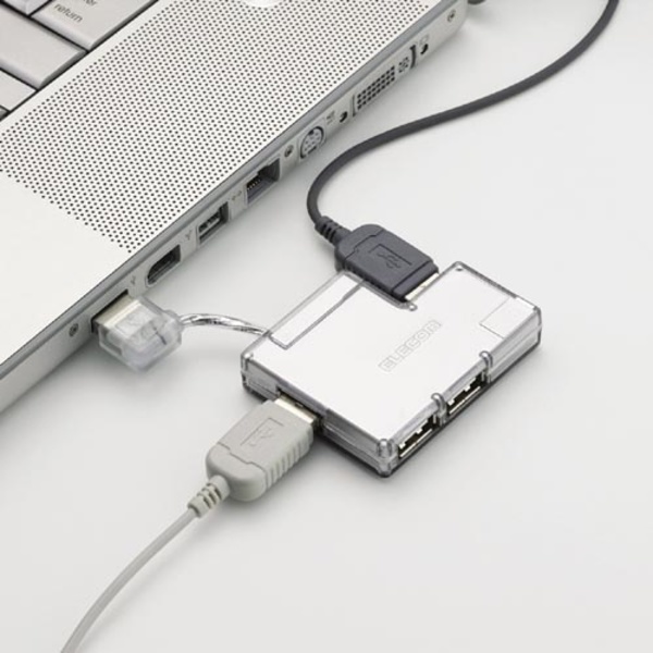 コンパクトなUSB2.0ハブ。アップストリームコネクタをダウンストリームポートに差し込んで収納可能。セルフパワー/バスパワー両用。