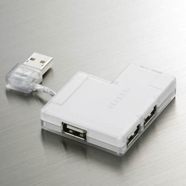 コンパクトなUSB2.0ハブ。アップストリームコネクタをダウンストリームポートに差し込んで収納可能。セルフパワー/バスパワー両用。