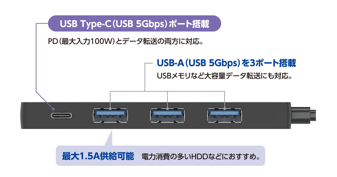 USB-A・USB Type-C™ポートを搭載したUSB Type-Cプラグ接続USBハブです。ポートの少ないパソコンでも多様な周辺機器を接続できます。