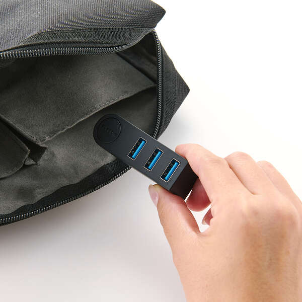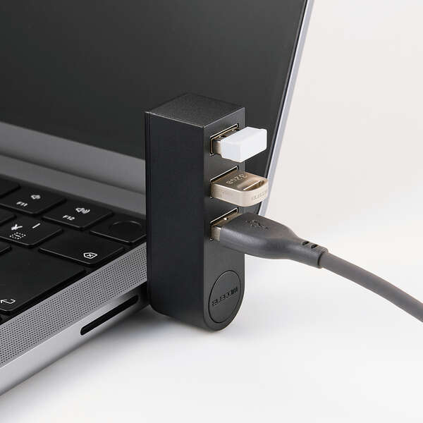 隣のポートをふさがず、手元すっきり。USB 5Gbps(USB3.2(Gen1))に対応したUSB Type-C(TM)プラグと3つのUSB-Aポートを搭載したUSBハブです。ケーブルなしの直挿し・スリム設計なのでデスクで邪魔にならず、本体を回転させれば他のポートに干渉せず使えます。