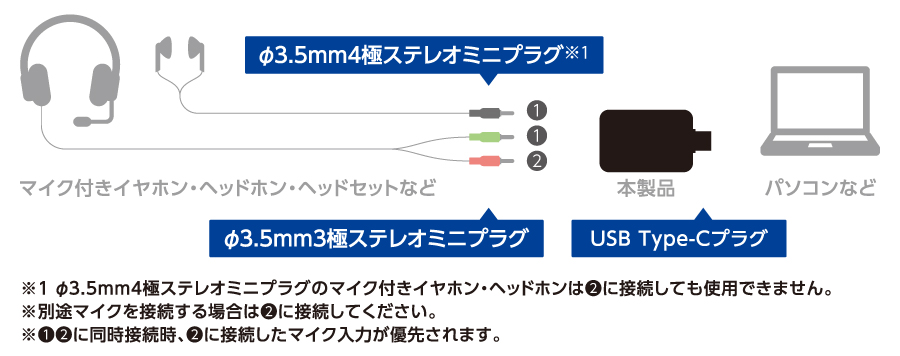 φ3.5mm4極ミニプラグ(CTIA規格)のマイク付きイヤホンに加え、ヘッドホン端子とマイク端子が分離したパソコン用ヘッドセットにも対応しています。