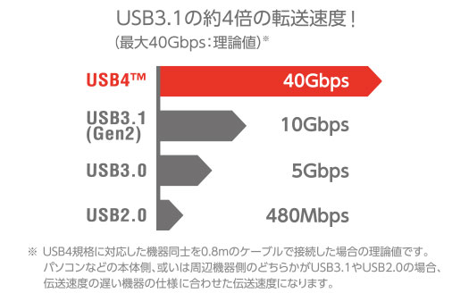 USB Type-C™を搭載しているパソコンなどに、USB Type-C™を搭載している機器を接続し、充電やデータ転送ができるUSB4ケーブルです。