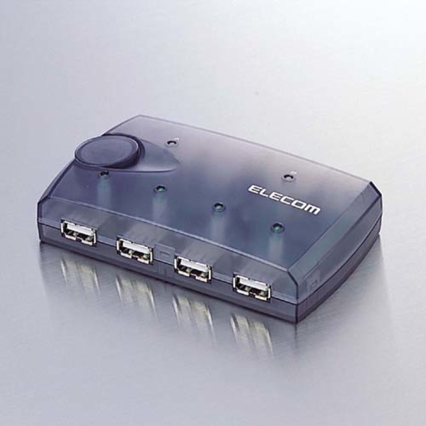 2切替のUSB切替器を内蔵した4ポートUSBハブ。パソコン2台で最大4台までのUSBデバイスを切り替えて使用可能。切替位置とともにデータ転送状況が確認できるランプで誤認識を低減できます。ケーブル2本、スイッチングACアダプタ添付。