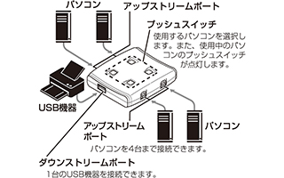 2台のパソコンで1台のUSBプリンタやストレージ機器を切り替えて使用できる切替器。