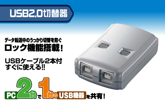 2台のパソコンで1台のUSBプリンタやストレージ機器を切り替えて使用できる切替器。USB2.0準拠。