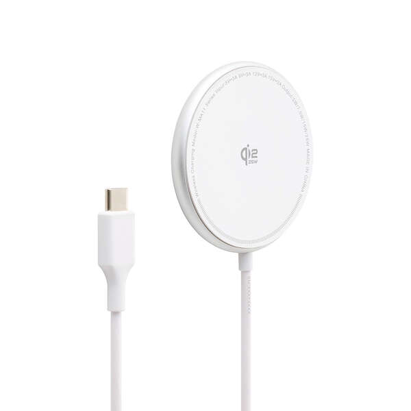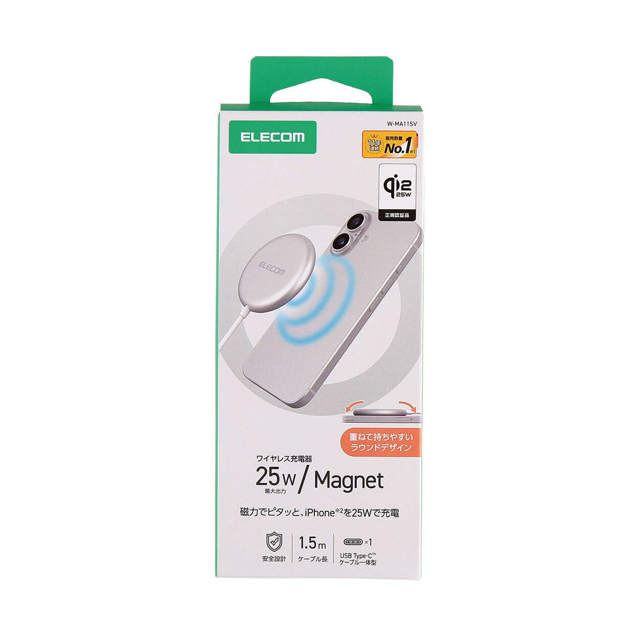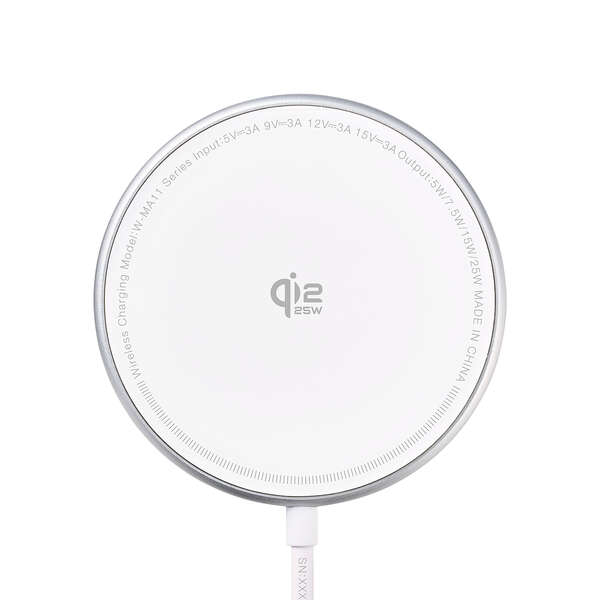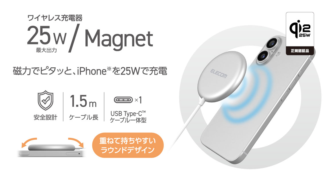 マグネットで対応するスマートフォンに固定するだけで高速充電できる、Qi2 25W規格対応のワイヤレス充電器です。